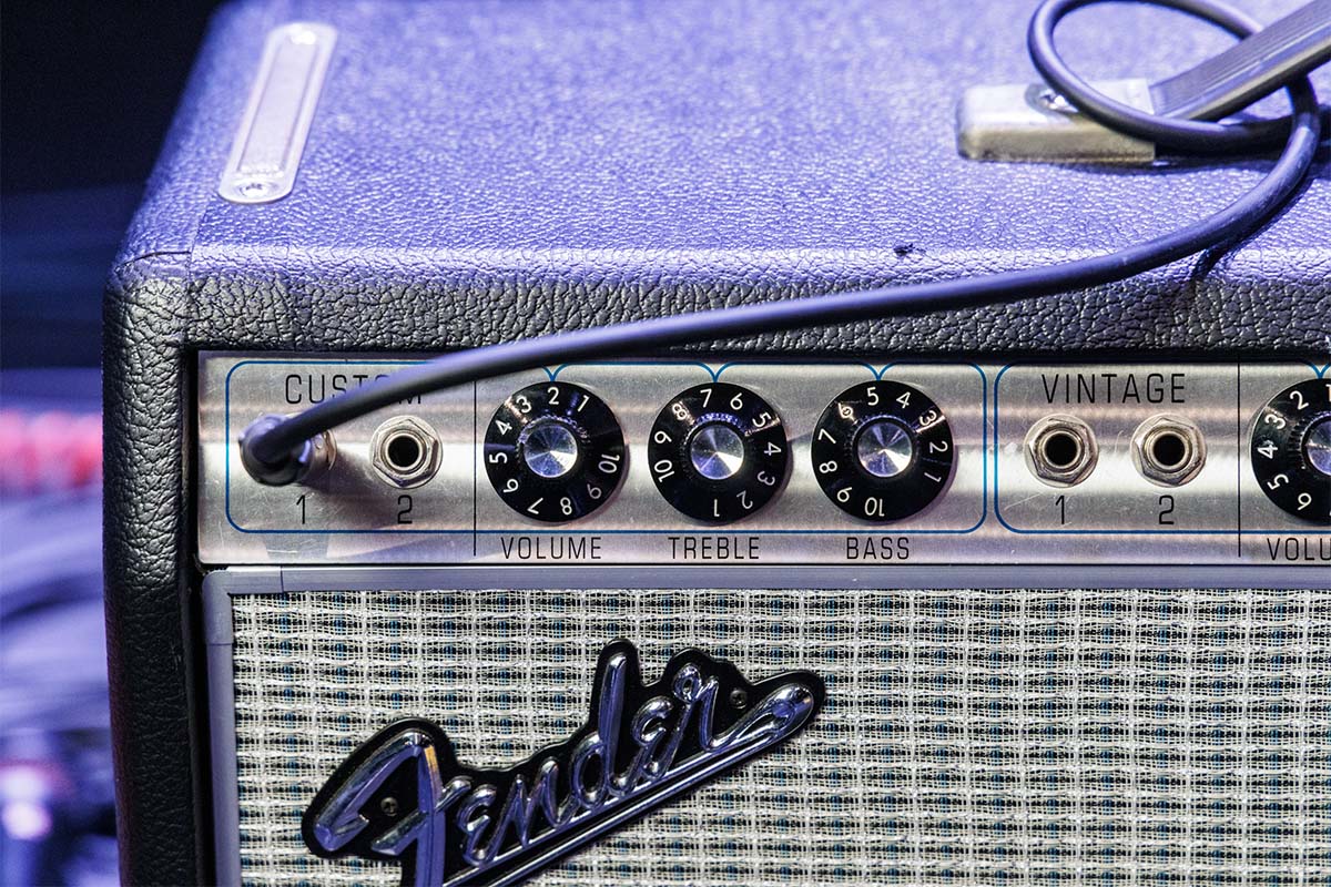 CUSTOM chにインプットし、各ノブはVOLUMEが2、TREBLEが7手前、BASSが5手前にセッティングされていた。アンプはクリーンで、音量はかなり小さめにセッティングされている。