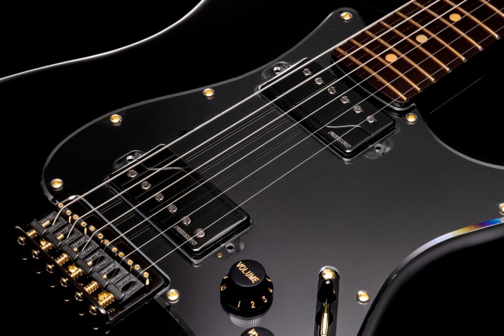 ハード面では、ハードテイル・ブリッジとFISHMAN製のハムバッキング・ピックアップを搭載している点が大きな特徴だ。ピッキングのレスポンスを重視し、あえてトレモロを排した仕様を選択。さらに、ピックアップをボディにダイレクト・マウントすることで、アクティブ回路の特性と弦振動の伝達を両立させている。
