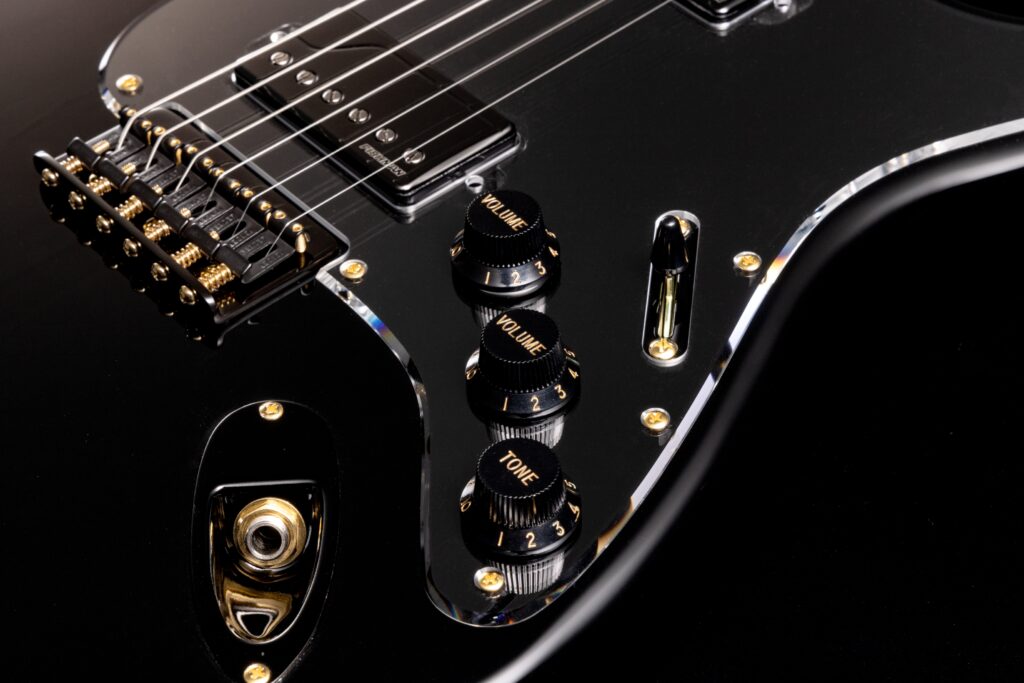 ハードウェアは、ネジなどの特定のパーツのみをゴールドに差し替えた特注のブラック&ゴールド仕様。ブラス製のナットや透明のアクリル・ピックガードなど、細部まで独自の美学が貫かれている。