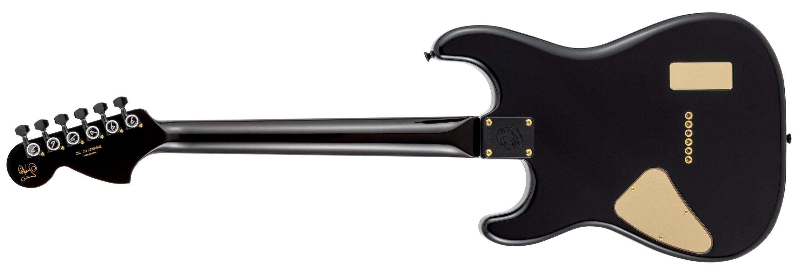 完全限定生産のシグネチャー・モデルとなるKen Stratocaster Dodomeは、ブラックを基調としたルックスをまとっており、ボディ表のエルボー・コンターとネックには日本の伝統色である“どどめ色”を採用。ニトロセルロース・ラッカー・フィニッシュによる漆のような深みのある光沢が、洗練されたコントラストを生み出している。