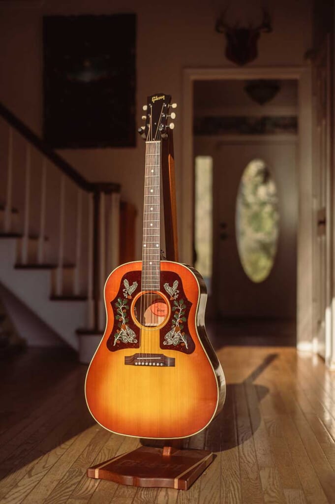 マーゴ・プライス自身の監修のもと、アカオノスリ(北米大陸に多数生息し、赤い尾羽が特徴的なタカ科の鳥)のデザインがあしらわれたダブル・ピックガードなど、独自のデザインを持つ“マーゴ・プライス J-45”は、米国モンタナ州ボーズマンにあるギブソン・アコースティックの熟練ルシアーによってハンドメイドで製作される。