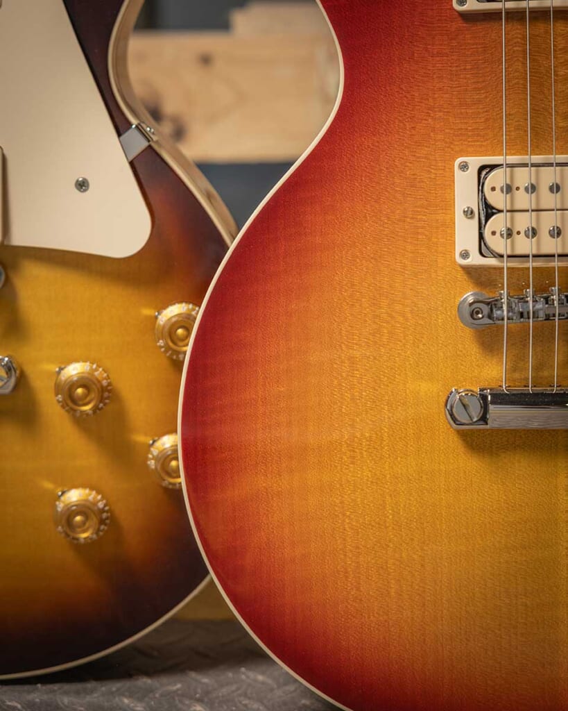 レギュラーモデルのグロス・ニトロセルロース・ラッカー・フィニッシュは各年代の新品同様の仕上がりを再現しているが、50sおよび60sの『レスポール・スタンダード ダブル・トラブル』では、わずかに色褪せたフルグロス・ニトロセルロース・ラッカーのヴィンテージ・カラー・フィニッシュで、年月を経て自然に生じた経年変化の風合いを再現している。