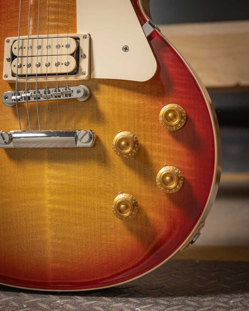 ABR-1 Tune-O-Maticブリッジ、アルミ製ストップバー・テイルピース、キーストーンボタン仕様のVintage Deluxeチューナー、ダイヤルポインター付きのエイジド・ゴールド・トップハット・ノブが搭載されている。