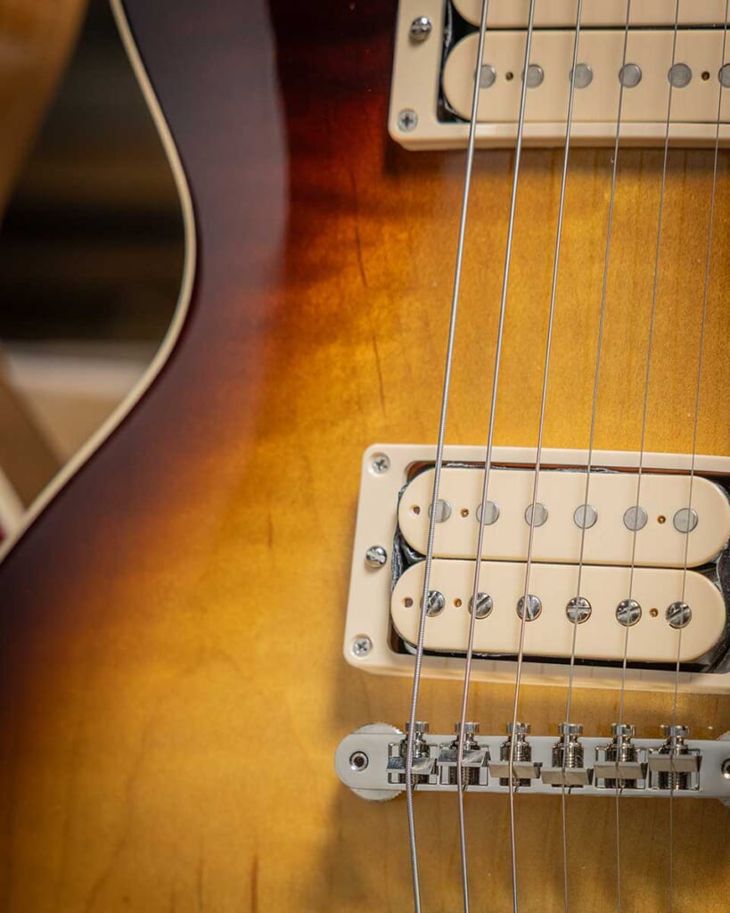 2つめの相違点はピックアップ。搭載されている2基のピックアップ。ピックアップ・カバー非装着(オープン・タイプ)のBurstbuckerは、ダブル・クラシック・ホワイトのボビンが採用されたピックアップとなる。