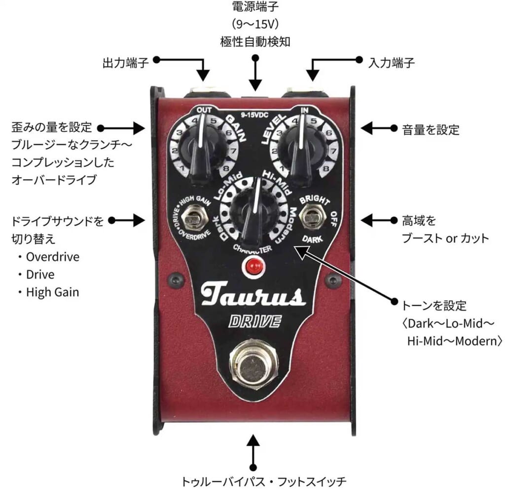 タウラスのGuitar Driveは、「オーバードライブ/クラシックドライブ/ハイゲイン」という3つの歪みサウンドをスイッチで選び、シンプルなコントロールで好みのサウンドに仕上げることができるペダルだ。