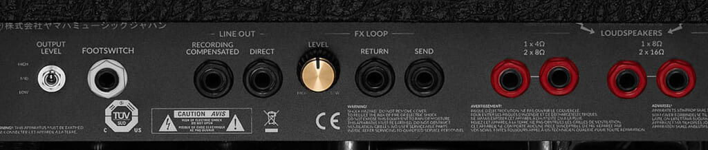 ライン・アウト端子は、プリアンプ信号を外部のパワーアンプに送るDIRECT LINE OUTと、レコーディング機器やインターフェイス、PA等に接続するためのRECORDING COMPENSATED LINE OUTの2つを装備。