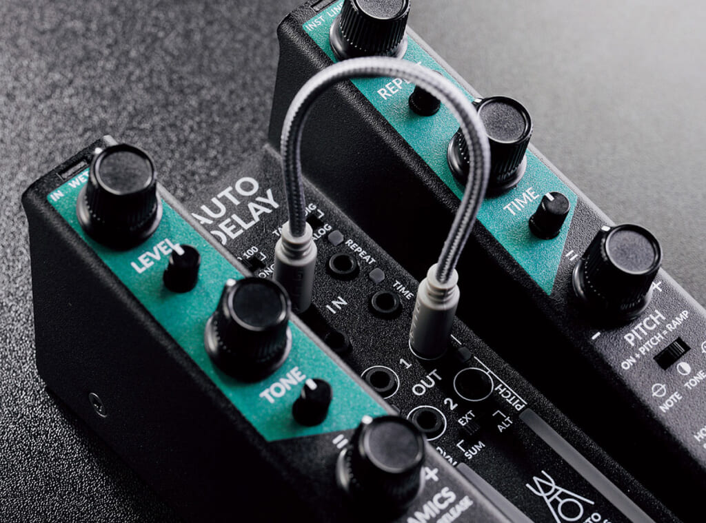 例えば、ダイナミクスとレベルを付属のパッチ・ケーブルでつなげると、一定の音量を超えた時にディレイ・レベルが上がりサウンド・オン・サウンドのように。