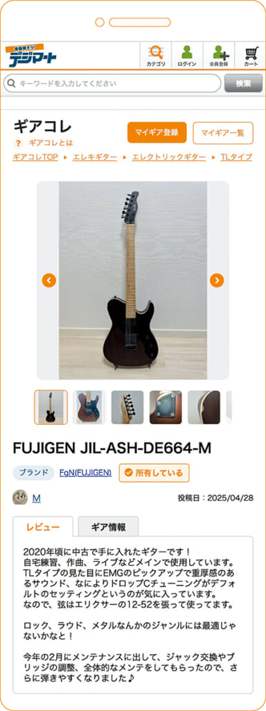 ▼ギアコレに登録完了! スマホから見るとこんな感じ。自分のレビューが誰かの新たな楽器との出会いのきっかけになるかと思うとワクワクする。