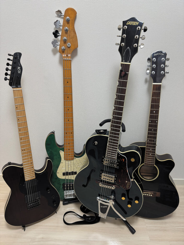 ① 編集部員Mの所有する楽器たち。2025年1月号のグレッチ特集の影響でついつい欲しくなり買ってしまったグレッチなどもあるが、今回は長年使用していて愛着のあるフジゲンのギターをマイギア登録してみることにする。