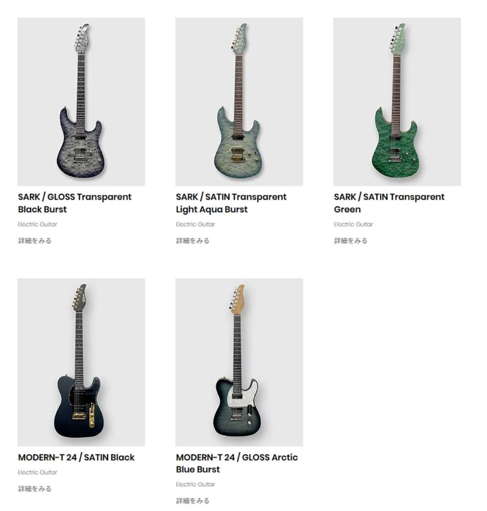 現在、日本向けのWebサイトで確認できるギター製品には、「SARK」と「MODERN-T 24」という2種類のシェイプが存在。さらにSARKは3モデル、MODERN-T 24は2モデルが展開され、この他にベース製品も3モデルがラインアップされた。