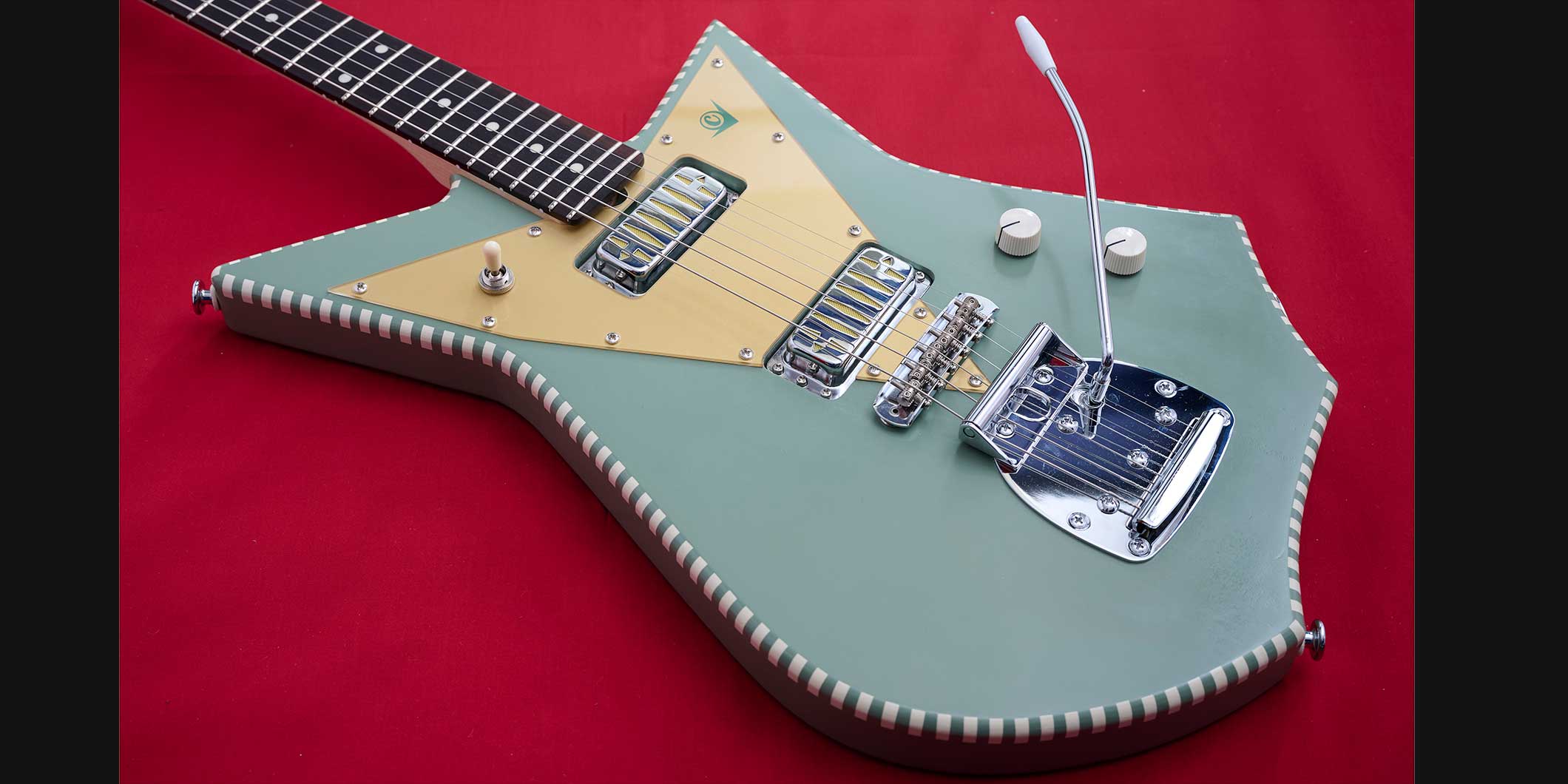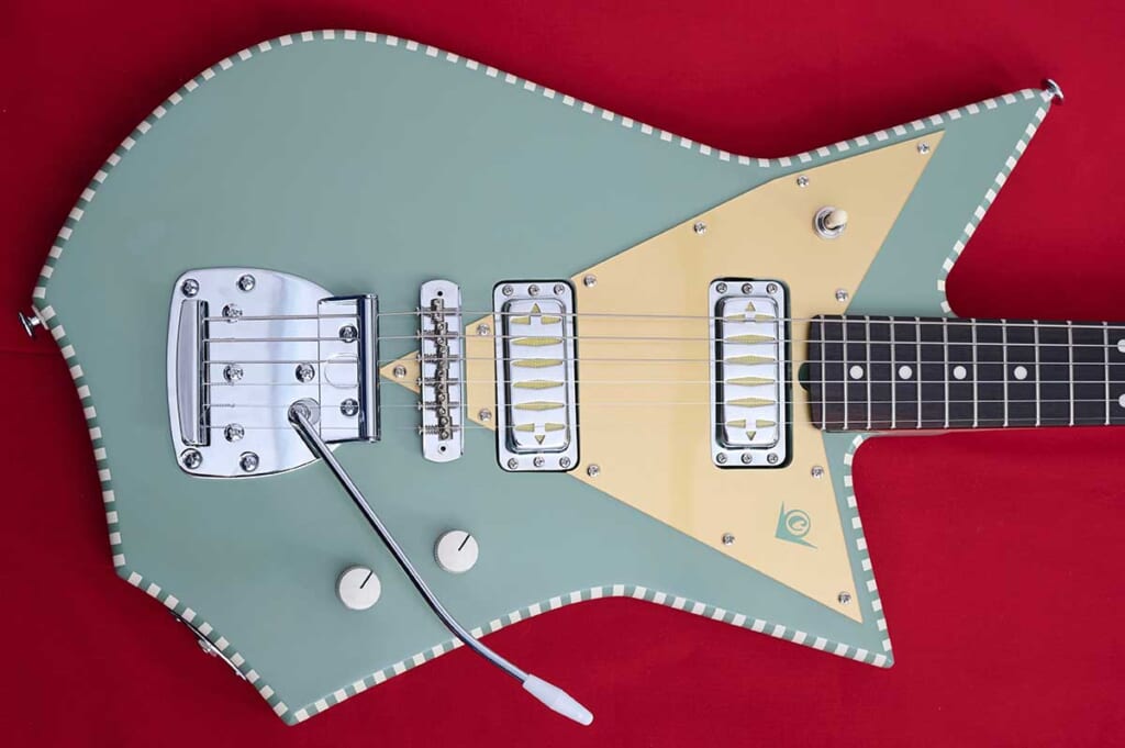 今回のPT5_ Cosmic Konpeito Tremolo Greenは、その名が示す通り「宇宙開発が進み未来的なデザインが好まれた1950年代のビザール・ギター」を思わせるデザイン。