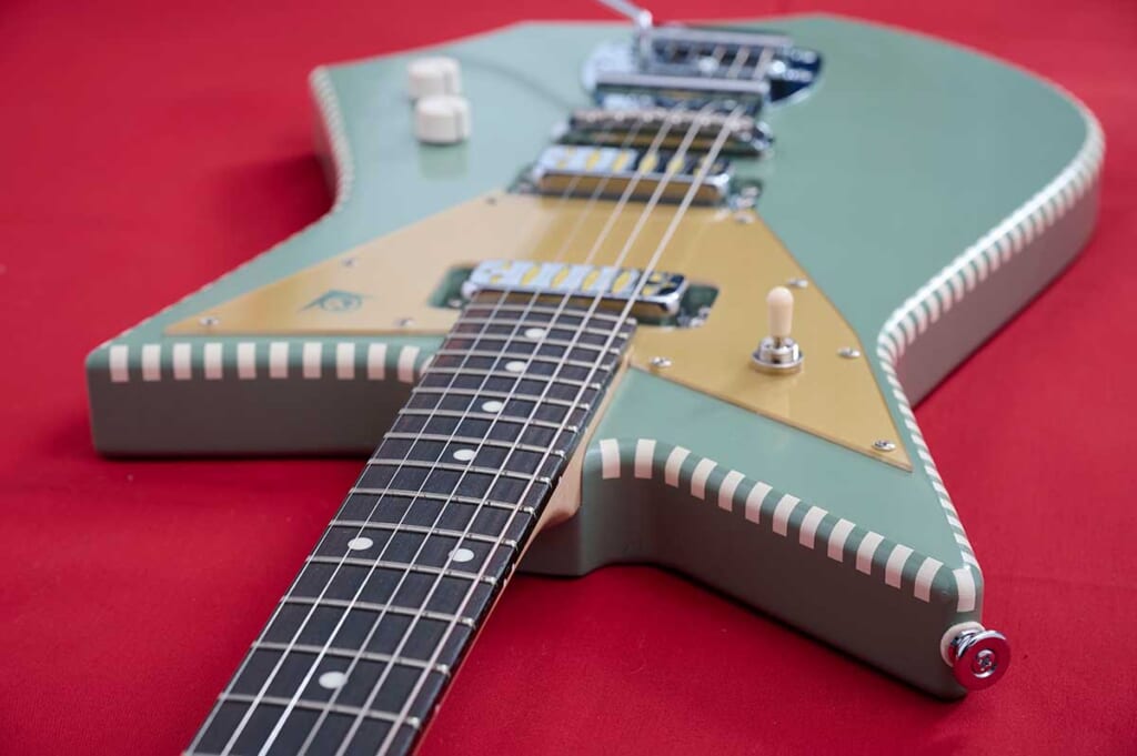 CGKのアイコニックなV字型ピックガードと、ボディ淵のチェッカード・ステッチは本機でも健在。