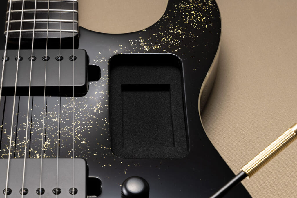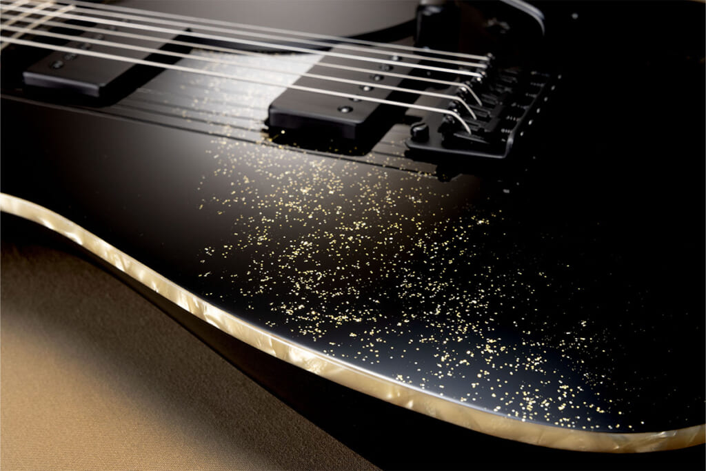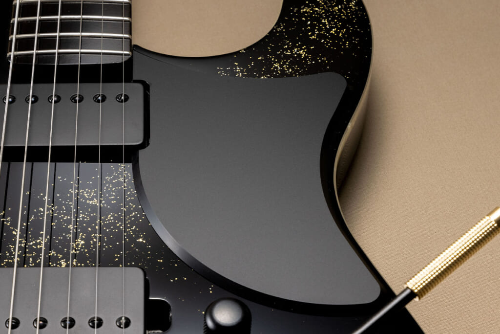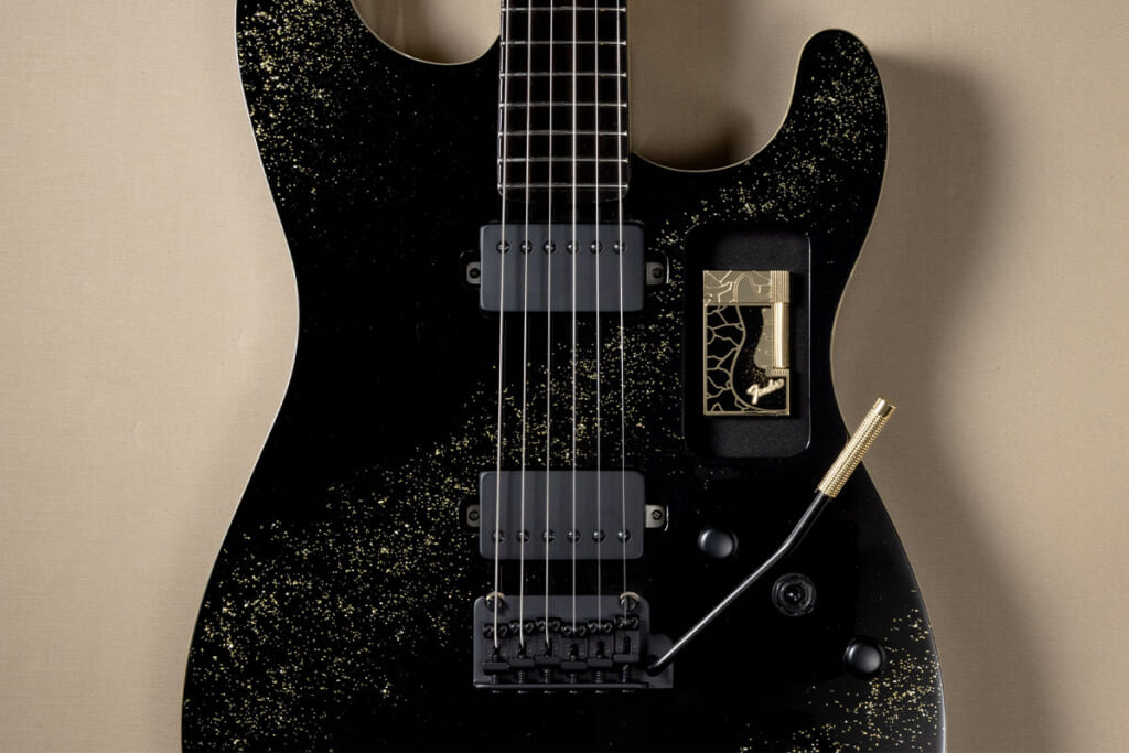 Made in Japan Limited S.T. Dupont Stratocasterのボティとヘッドストックには、熟練の職人が1点ずつ丁寧に仕上げたゴールド・ラメ・フィニッシュが採用されている。