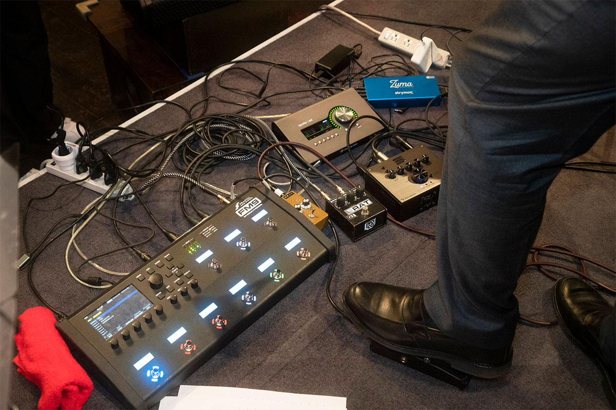 ①KR-1からは②FM9のIN1にインプット。②FM9のOUT1からステレオで③Seymour DuncanのPowerstage 100 Stereoを経由し、ステージ上に置かれていた2台のフェンダー・アンプのパワー・アンプ部分に接続。つまり、フェンダー・アンプはスピーカー部分のみを使用しており、メインのサウンドは②FM9で作成したものを鳴らしている。