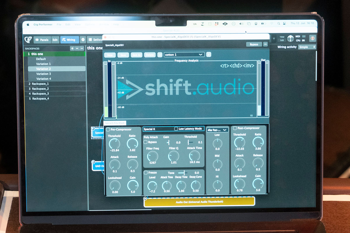 ⑤Apollo x4と接続されているMacBookではGig Performerを立ち上げ、現在カートとPigtronixが共同開発中のペダルのプラグインを使用。ここで“音のアタックの部分を変えるエフェクト”を管理している。今後はこれをカートのシグネチャー・ペダルとして製品化するとのこと。
