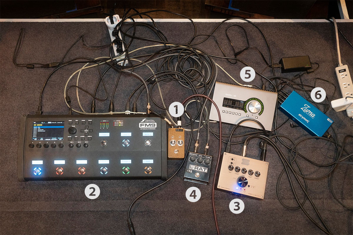 そこからFM9(②)につながっているんだけど、FM9でおもに使うのはディレイとリバーブだ。かなりノーマルなエフェクトだよね。ほかにはコンプレッサーをちょっと使うこともあるし、リード・サウンドではRAT(④)のディストーションを使うことがある。これが僕のベーシックなサウンドだ。