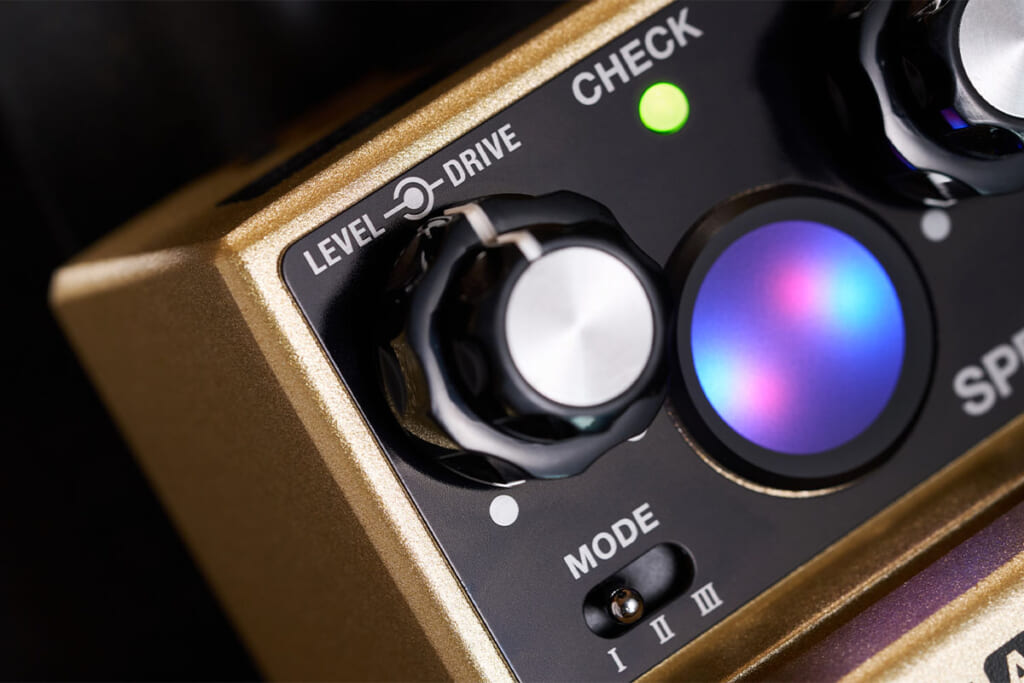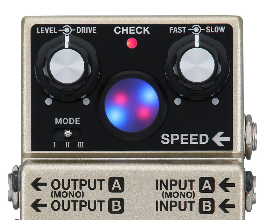 本機は、ビンテージ・ロータリー・スピーカーによって生み出される特徴的な揺れと豊かで空間的な広がりを細部まで再現した上で、オリジナルの音色を含む3タイプのエフェクト・モードを搭載し、シンプルな操作性をも実現したペダルだ。