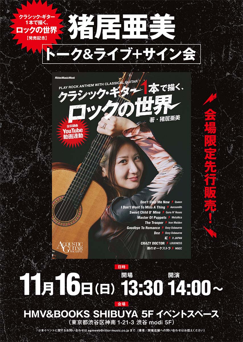 クラシック・ギタリストの猪居亜美による楽譜集ムック『クラシック・ギター1本で描く、ロックの世界』の発売を記念して、2025年11月16日(日)に東京・HMV&BOOKS SHIBUYA 5Fイベントスペースにて、猪居によるトーク&ライブ+サイン会が開催される。