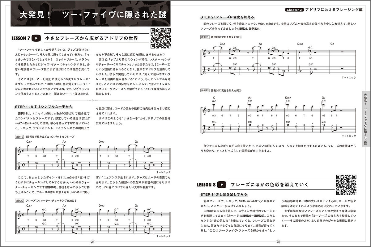 各項には、誌面と対応する動画のQRコードがついており、スマートフォンで読み取ると、その場で参考動画をご覧いただけます。指の動きやコードの押さえ方、ちょっとしたニュアンスなどは、ぜひ動画で確認してみてください。誌面と併せて学ぶことで理解が深まり、実際の演奏にも繋がりやすくなります。学んだフレーズやアイディアが少しずつ繋がり、自然とアドリブや伴奏に活かせるようになるはずです。