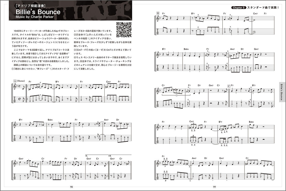 このChapterでは、「Billie’s Bounce」でのアドリブ模範を通して、学んだ内容が実際の演奏でどう現れるかを体感できます。さらに有名スタンダードのソロ・ギター・アレンジを収録しました。