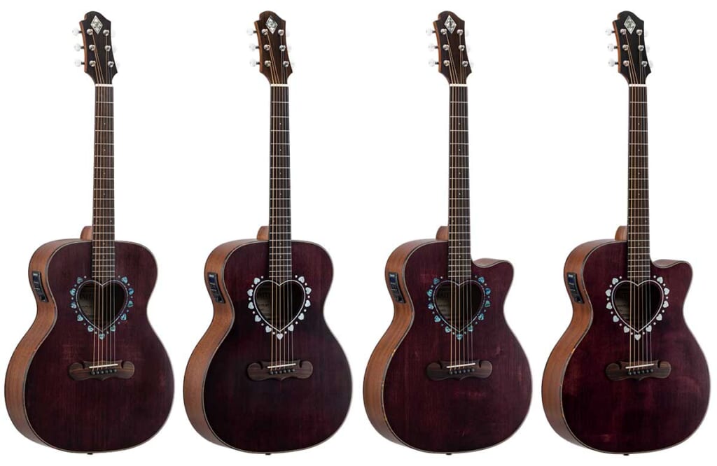 ハート型サウンドホールが印象的なオーケストラ・サイズのアンダーサドル・ピックアップ搭載エレクトリック・アコースティック・モデルCAF-90Hと、カッタウェイ・モデルのCAF-90HCWには、アバロン柄ロゼッタとマザー・オブ・パール柄ロゼッタそれぞれのモデルに、新カラーとなるアンティーク・フィニッシュのパープルが追加された。