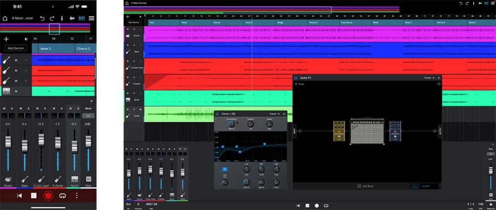 アプリ画面でワンタップすればすぐにレコーディングを始められる“Fender Studio”は、アイデアが湧いたその瞬間に、場所を問わずアイデアを録音し、音楽を制作することができる。
