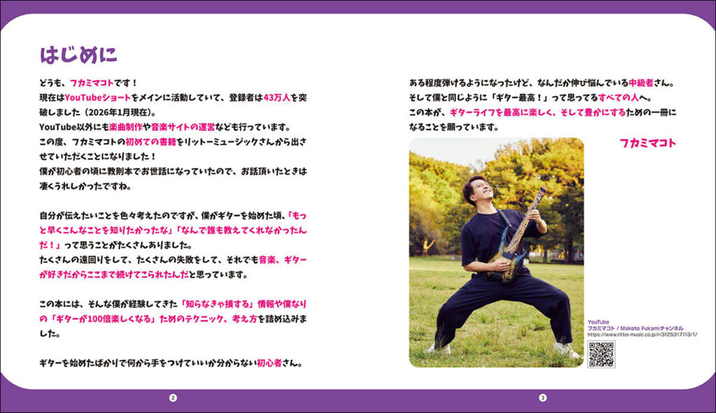 ギタリスト向けの教則本『フカミマコトの「顔で弾けばギターは100倍楽しい!」 YouTuberが教える「届かせる」「バズらせる」ためのマル秘テク』が、2026年2月20日(金)にリットーミュージックより発売される。