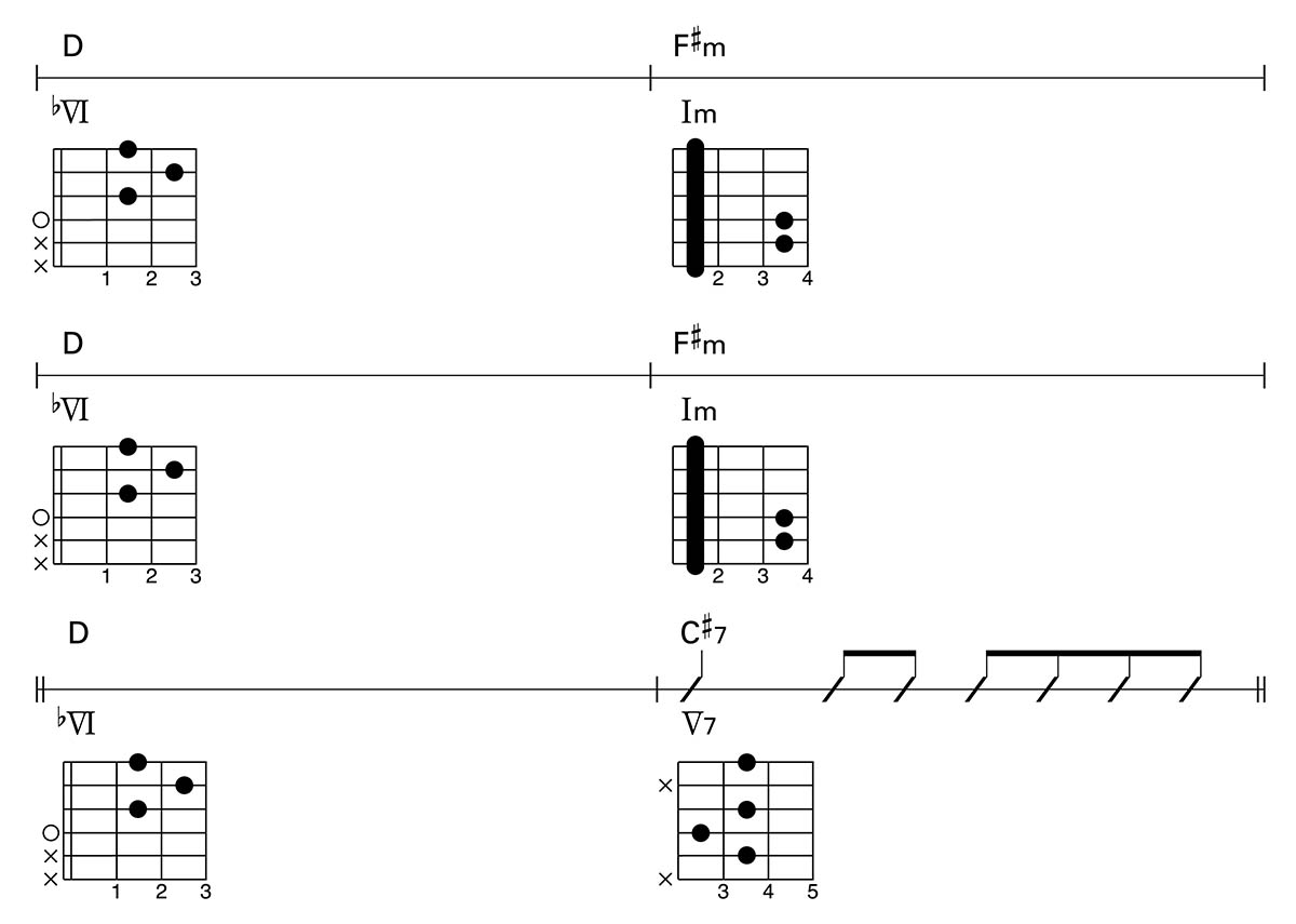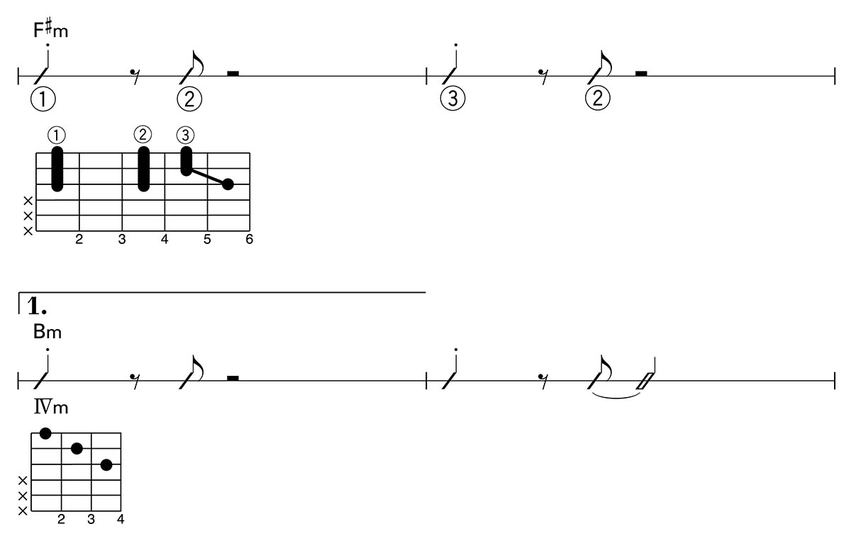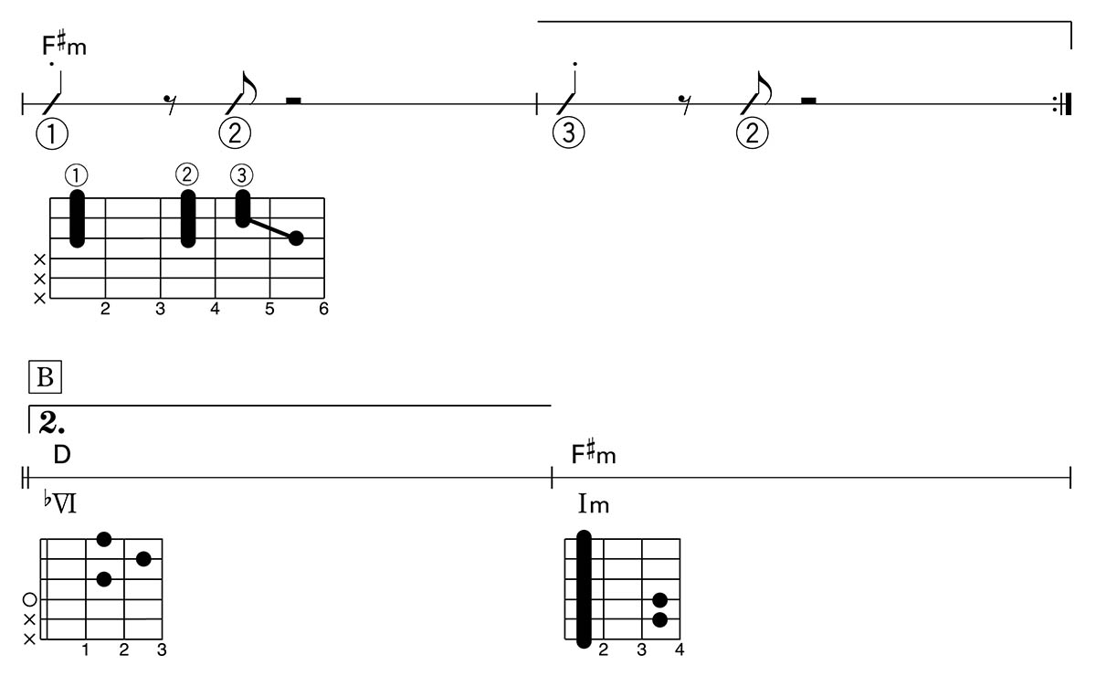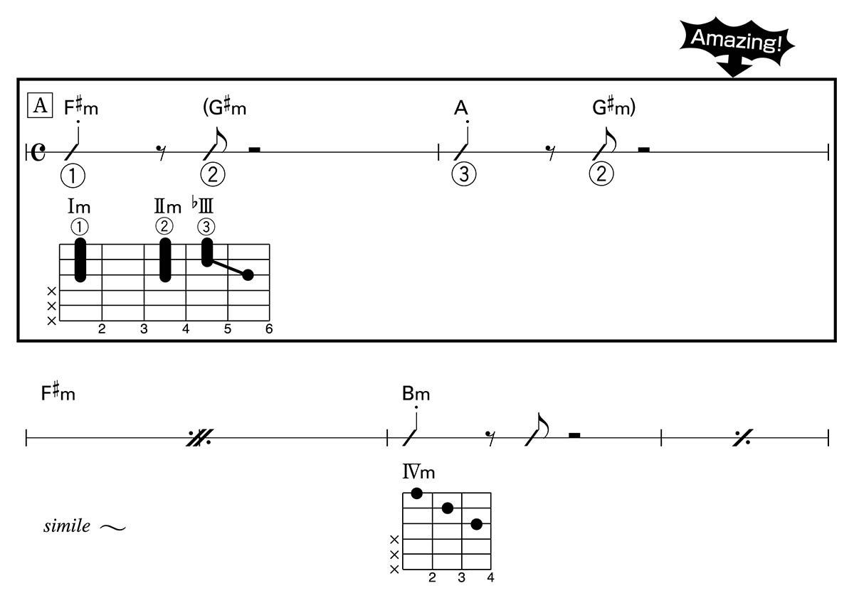 註1:譜例に記入した各コード・フォームは、キーボード類で演奏される楽曲全体の和音感をギター1本で体感できるようにモデリングしたものです。/註2:本トラックはピッチがやや高めなのでチューニングを要確認。