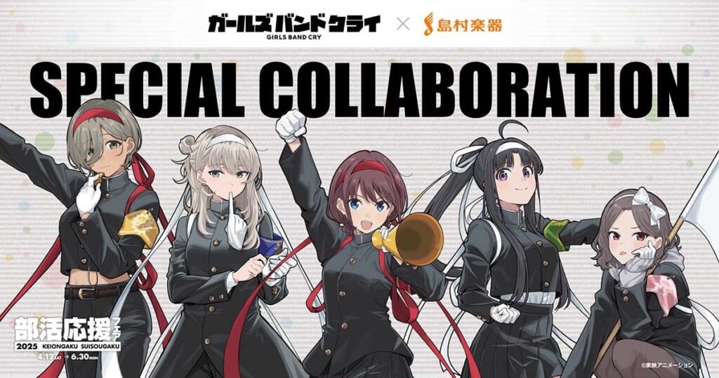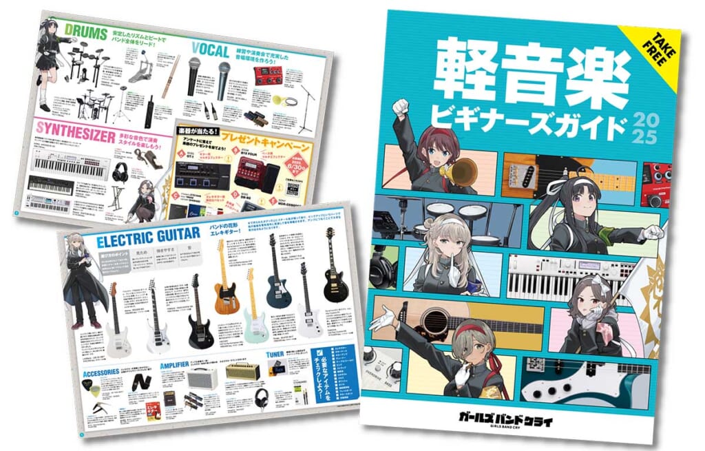 TVアニメ『ガールズバンドクライ』とのコラボレーションとなる『部活応援フェア2025』。期間中は、軽音楽初心者に役立つ情報をまとめた「軽音楽ビギナーズガイド」を無料配布。また、対象商品を税込3,000円以上購入で、吹奏楽部での練習計画に役立つ「吹奏楽手帳」をプレゼントする。