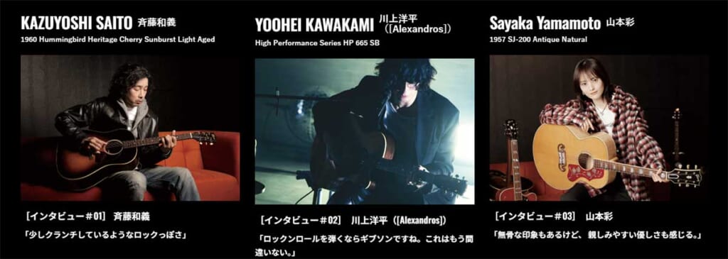 ギブソン・アコースティック・モデル スペシャル・サイト『Gibson Acoustic Evolution(ギブソン・アコースティック・エボリューション)』に、日本国内のギブソン・アコースティック・プレイヤーを代表する、斉藤和義、川上洋平([Alexandros])、山本彩へのインタビューが掲載されている。